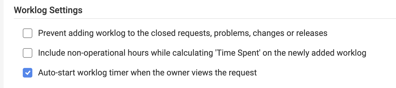 The worklog timer can be configured to start automatically when the owner of the task views the request. In order to configure this, navigate to setup > general settings > advanced portal settings > worklog settings > enable "Auto-start worklog timer when the owner views the request" > save the changes.
