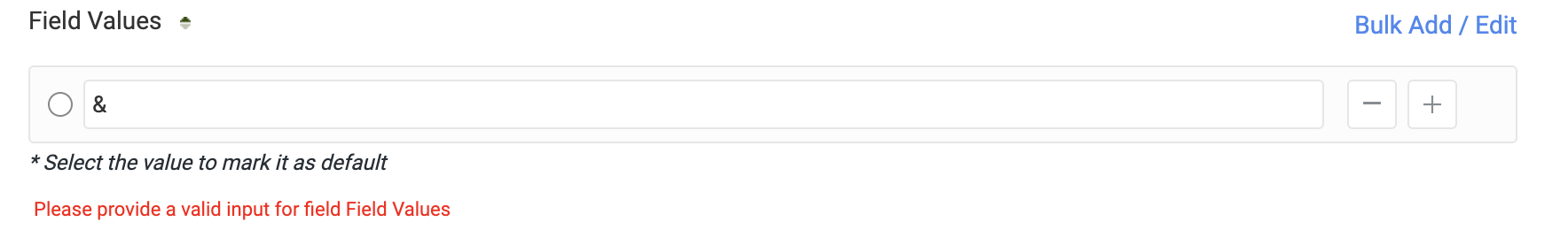 The following error will be found while creating an additional field value and if any special character is used apart from the one mentioned above