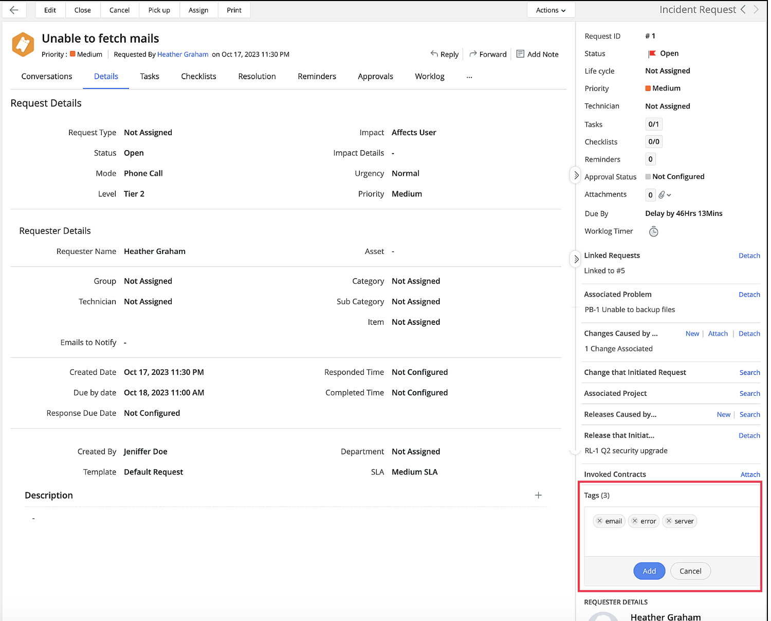 Tags help technicians find requests based on a topic of interest and can be added within each request.