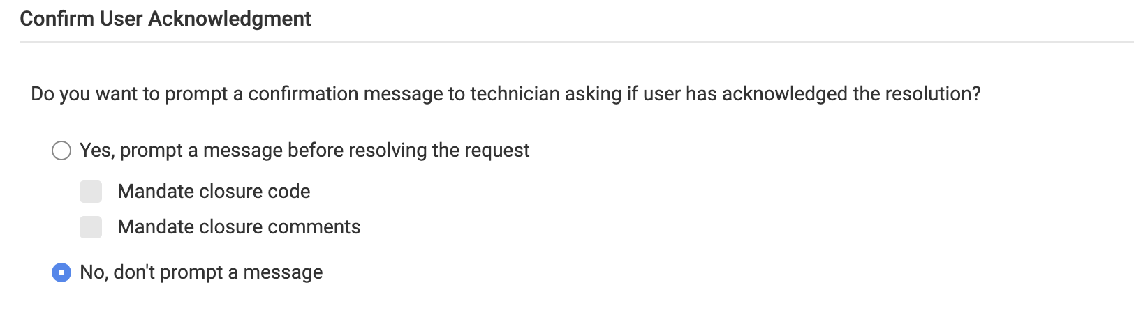- Navigate to Setup → Automation → Closure Rules → Request Closure rules → Confirm User Acknowledgment to disable the prompt.