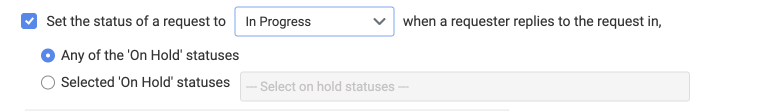 5. How can I set the status to "Reopened" (custom "In Progress" status) whenever a requester replies to an "On Hold" request?