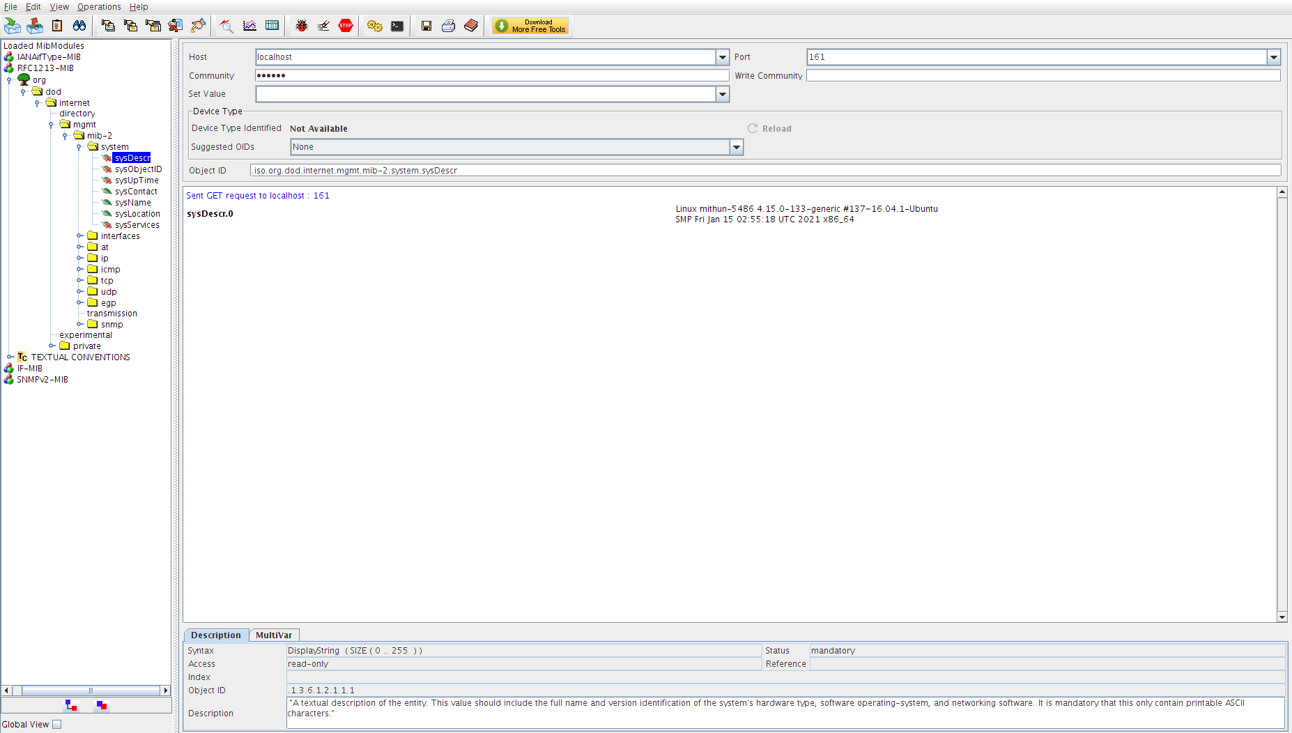 - Once the MIB is loaded, it will be present in the left panel under Loaded MibModules. Expand the Mib file and select the attribute. Click on "GET SNMP variable" operation or right click the node and select "GET". The value associated will be displayed. Any failures will also be displayed in the tool with appropriate error message