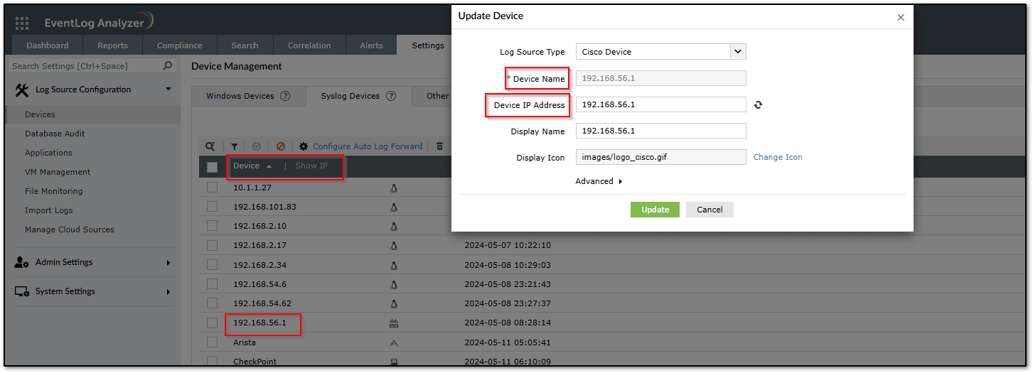 Step 5: The device will be added automatically in the application with the device name by resolving the DNS. You can locate the device name in Settings >> Log Source Configuration >> Devices >> Syslog device. Refer Tips to know How a device is added once the log packet reaches the application.