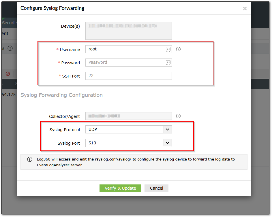 NOTE: The above configuration will only enable forwarding the machine logs to the EventLog Analyzer server.