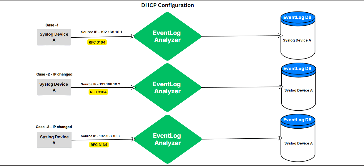 Prerequisite: Forwarded syslogs from all the syslog devices to Eventlog Analyzer should adhere to standard RFC 3164 and the corresponding DHCP configuration must be enabled in EventLog Analyzer.