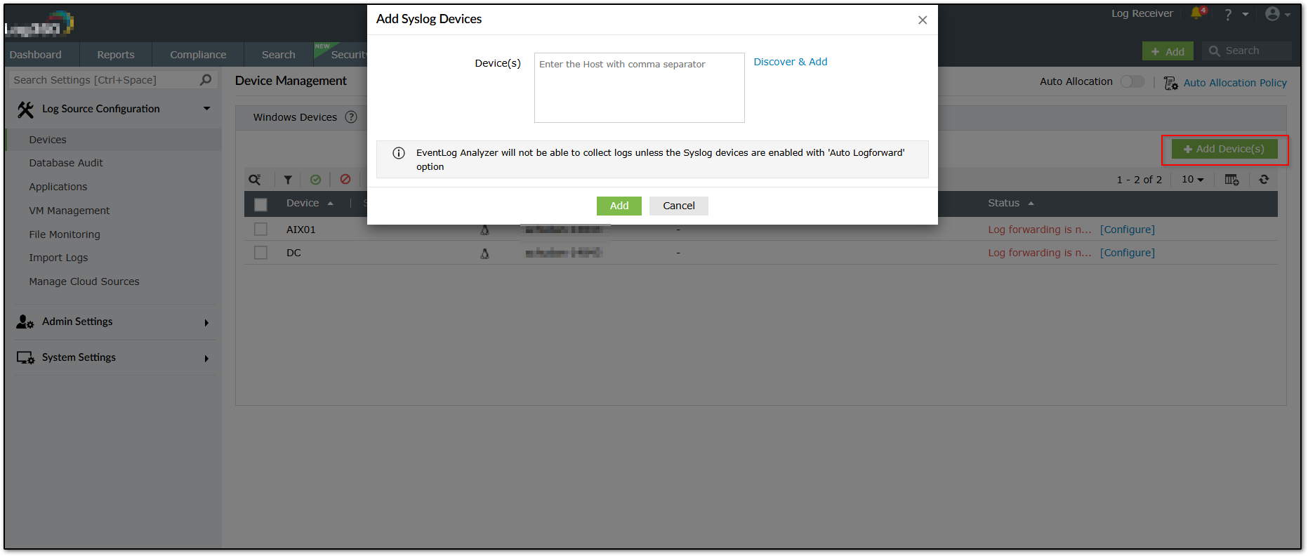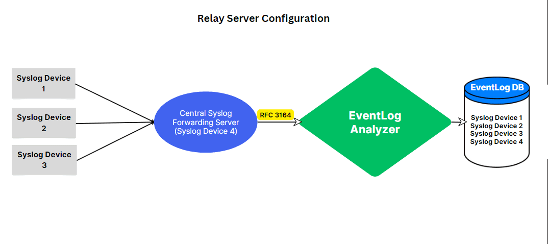 2. If multiple devices forward logs via a relay server, EventLog Analyzer uses the hostname from syslog packets to differentiate devices.