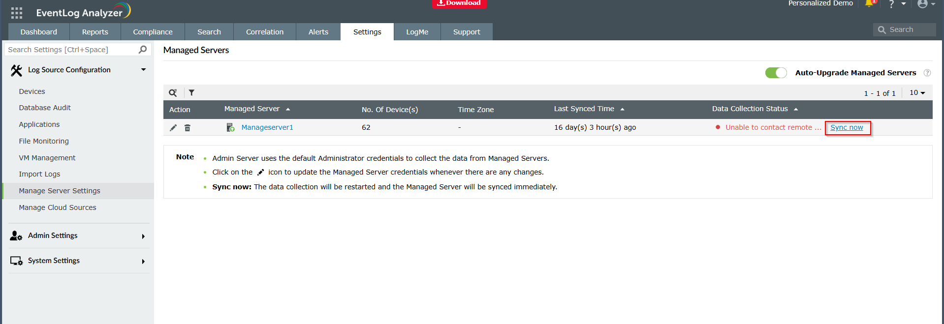 For the distributed edition, periodically ensure that the Admin Server and Managed Servers are properly synchronized by navigating to Settings > Managed Server Settings from the Admin Server console. If you notice any errors or delays in synchronization, click the Sync Now button next to the respective server.