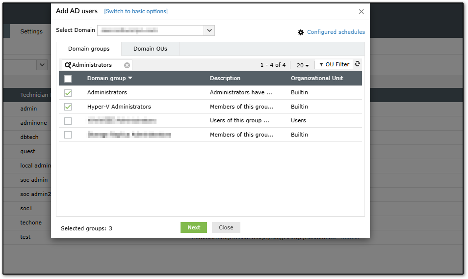 4. You can add users based on their Domain groups and Domain OUs. The domain groups/OUs will be automatically discovered and displayed for the selected domain.