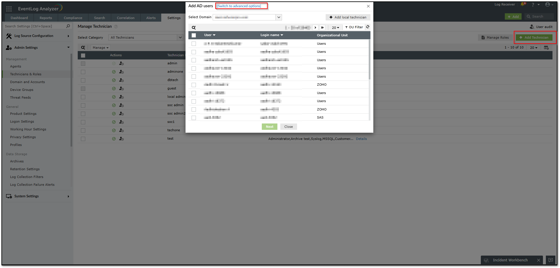 3. EventLog Analyzer will automatically discover and display Active Directory users from the selected domain. Click Switch to advanced options.