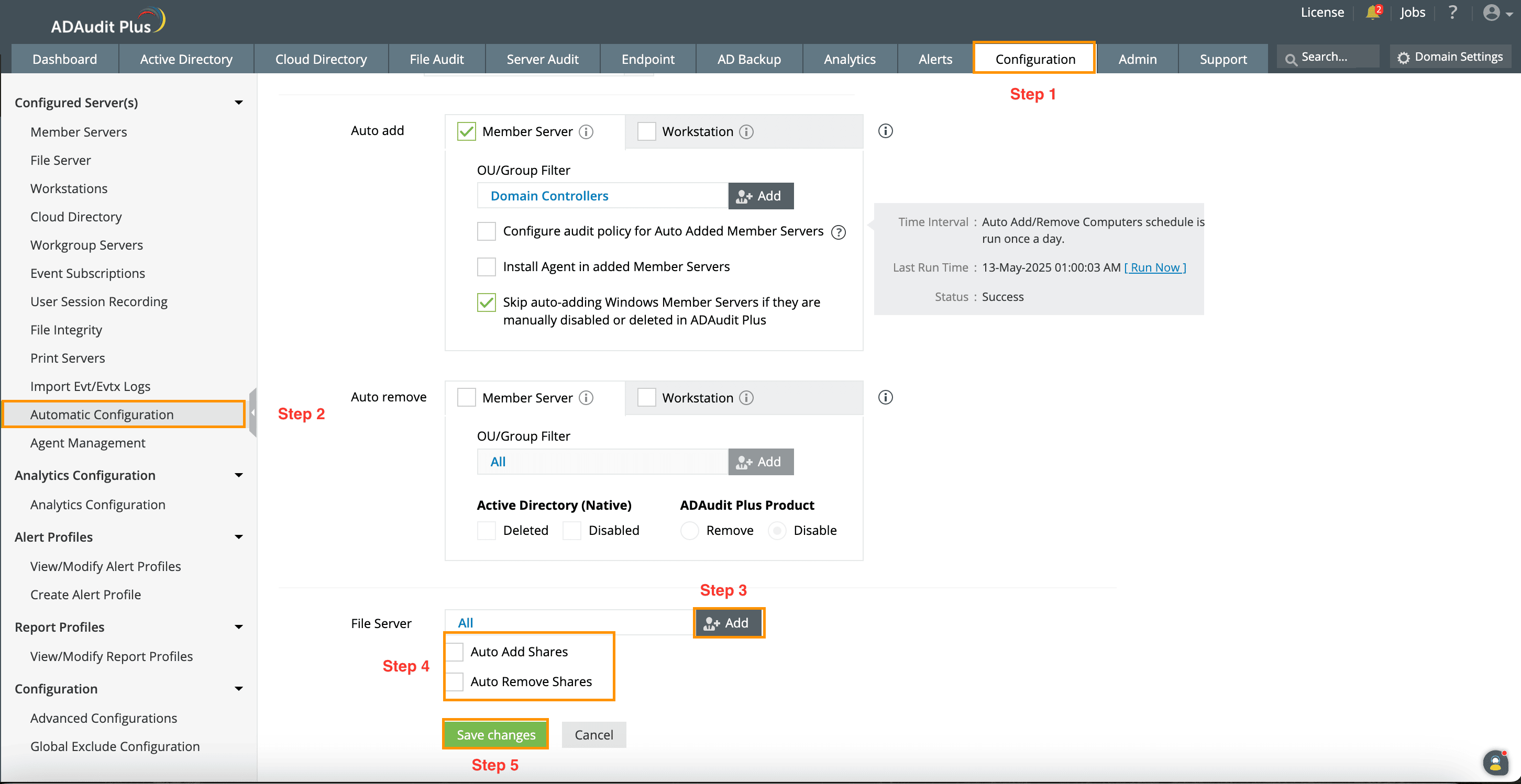 Newly added workstations or member servers will be configured only if they are covered under the applied license. Ensure that you have sufficient licenses to automatically configure them in ADAudit Plus.