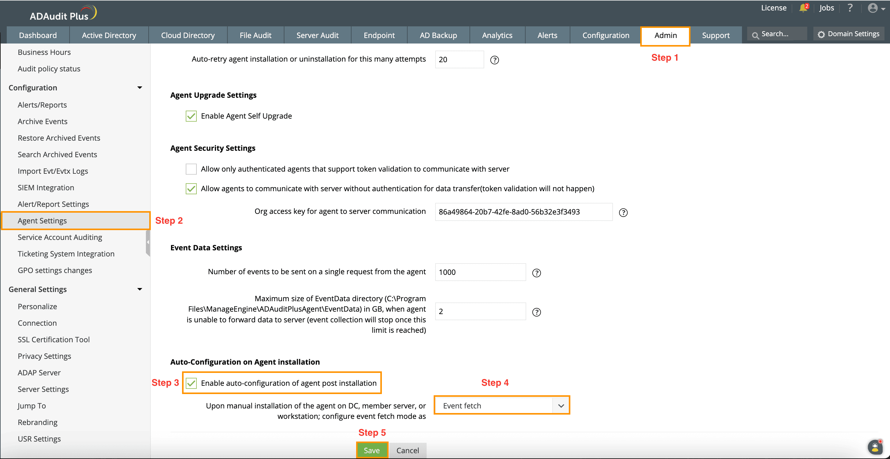 Have the default admin account credentials to log in to ADAudit Plus or a technician account with sufficient privileges to modify configuration settings.