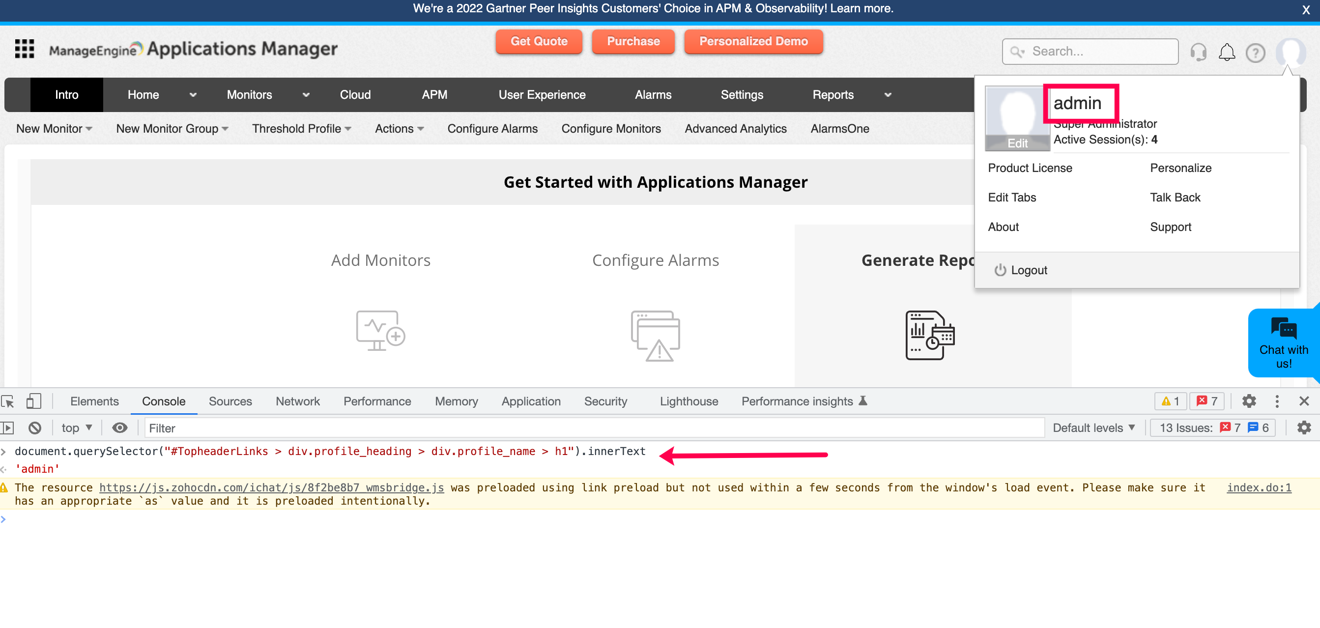 For instance, in Applications Manager, the username will be displayed on clicking the profile icon. By utilizing a CSS selector, we can identify the location of the element in the DOM, and then generate a script to extract the username from the DOM.