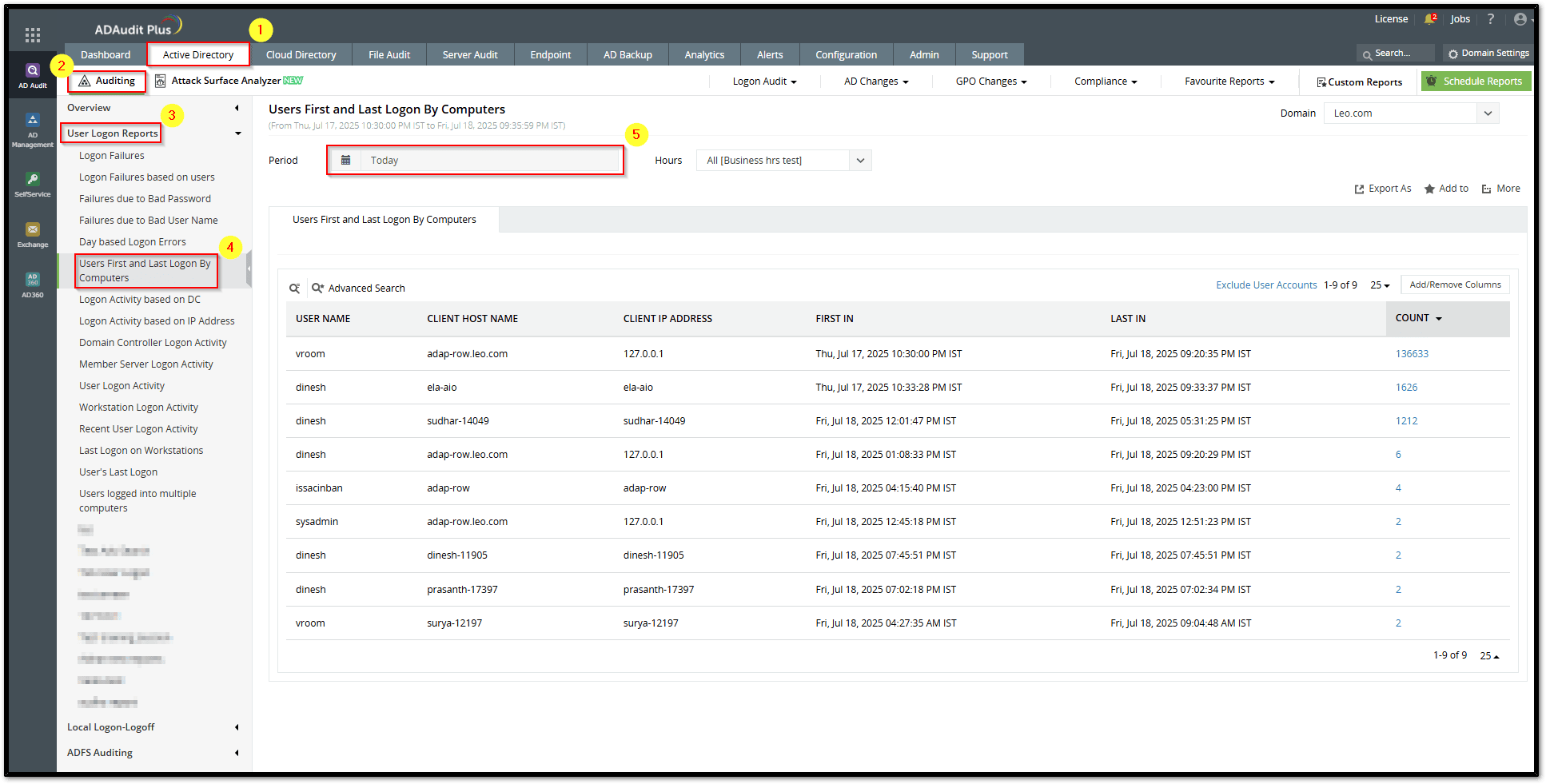 This article explains how to access the Users First and Last Logon By Computers report in ADAudit Plus. This report helps administrators track the initial and most recent logon times of users on specific computers within the domain.