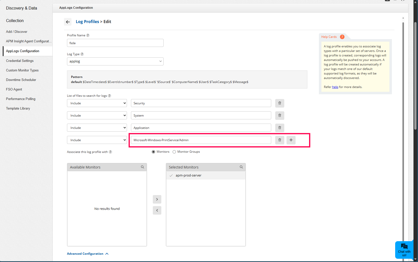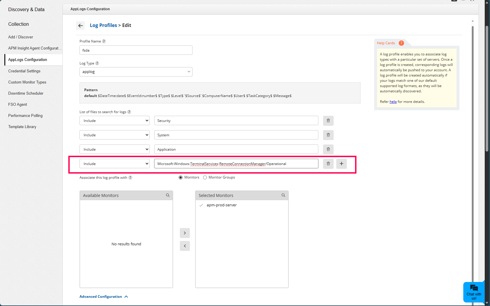 - Navigate to Settings → AppLogs Configuration → Log Profiles and click on the edit icon of the Windows Event Log profile you've configured.