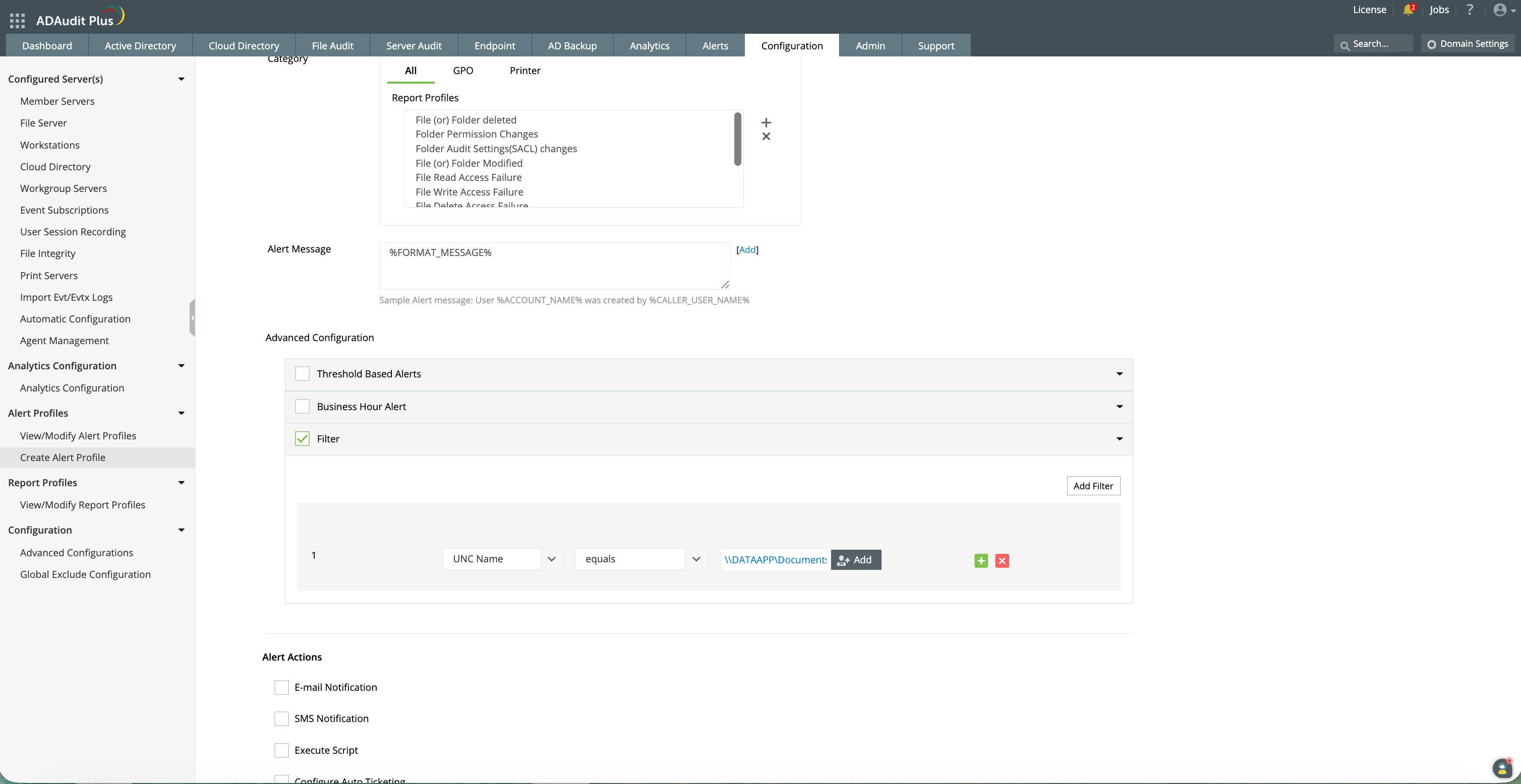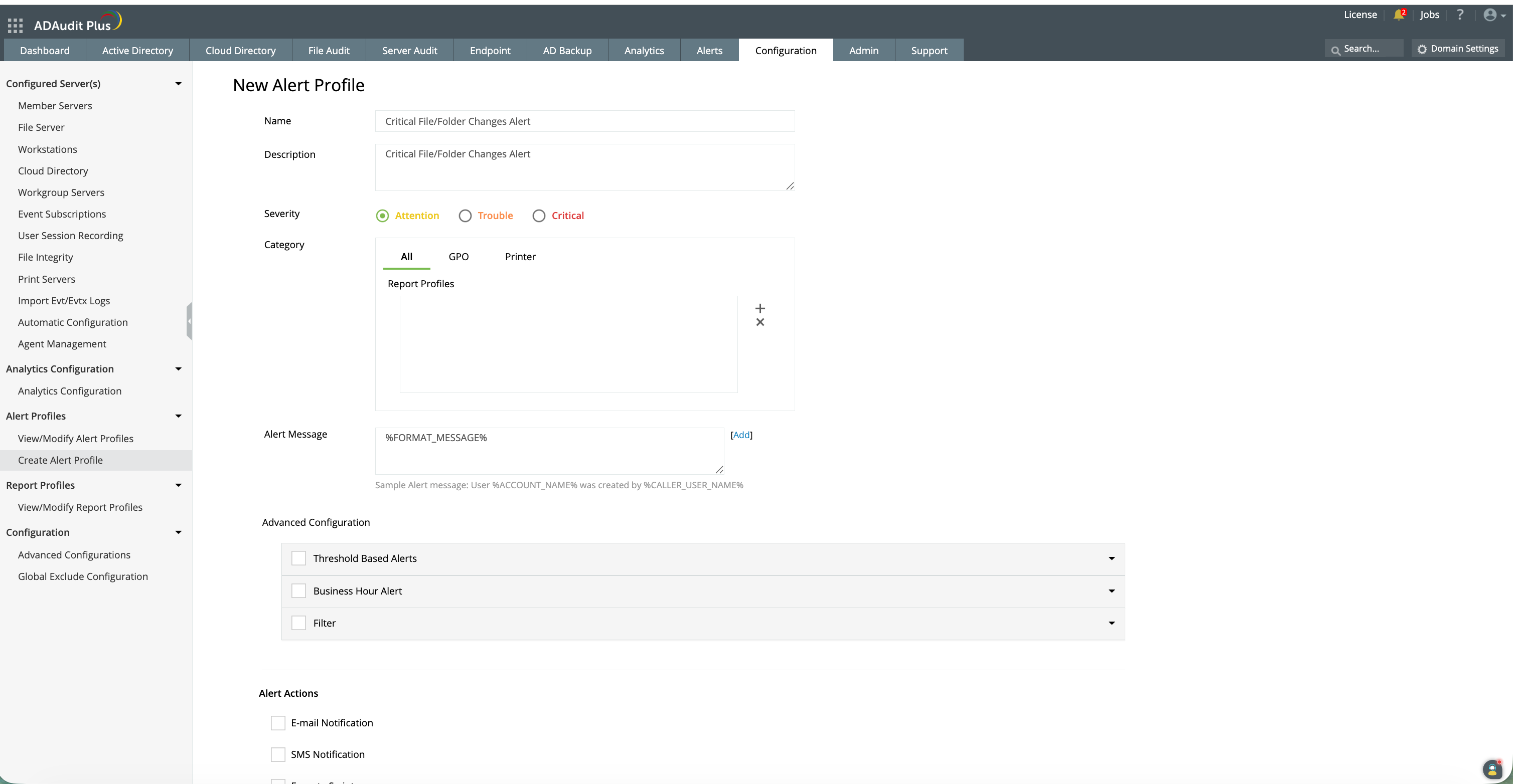 You must have access to the ADAudit Plus web console with an administrator account or a technician account that has permissions to create alert profiles.