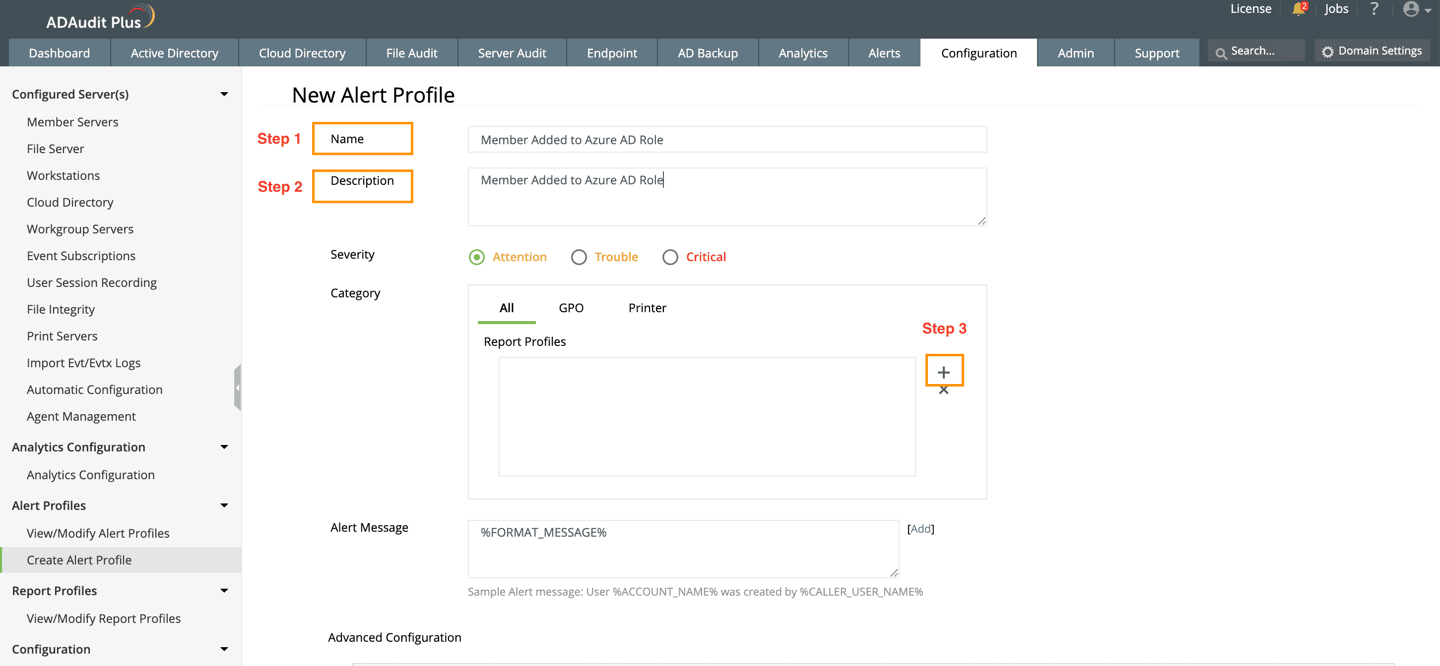 Enter a relevant Alert Name and Description (e.g., Member Added to Azure AD Role).