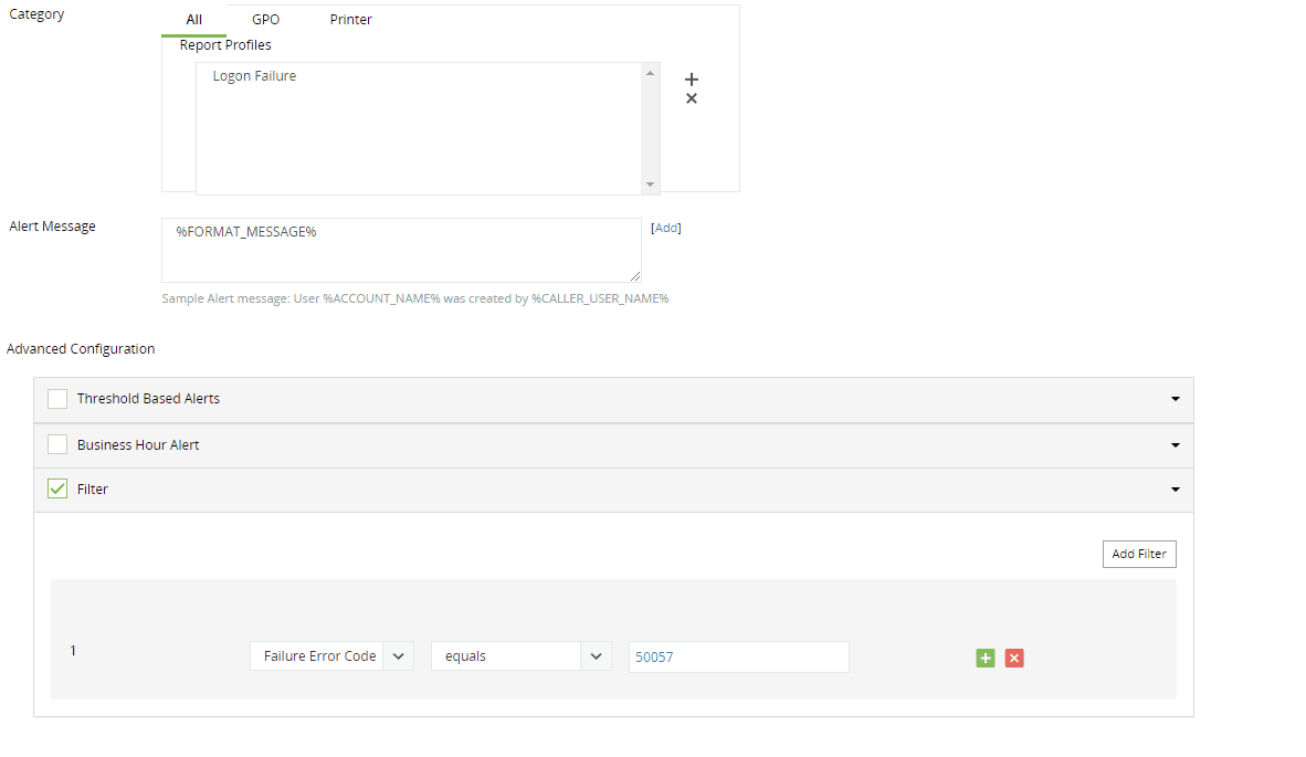 If a ticketing tool is integrated with ADAudit Plus (Admin > Configuration > Ticketing system Integration), enable the Configure Auto Ticketing checkbox to automatically generate tickets for alerts.