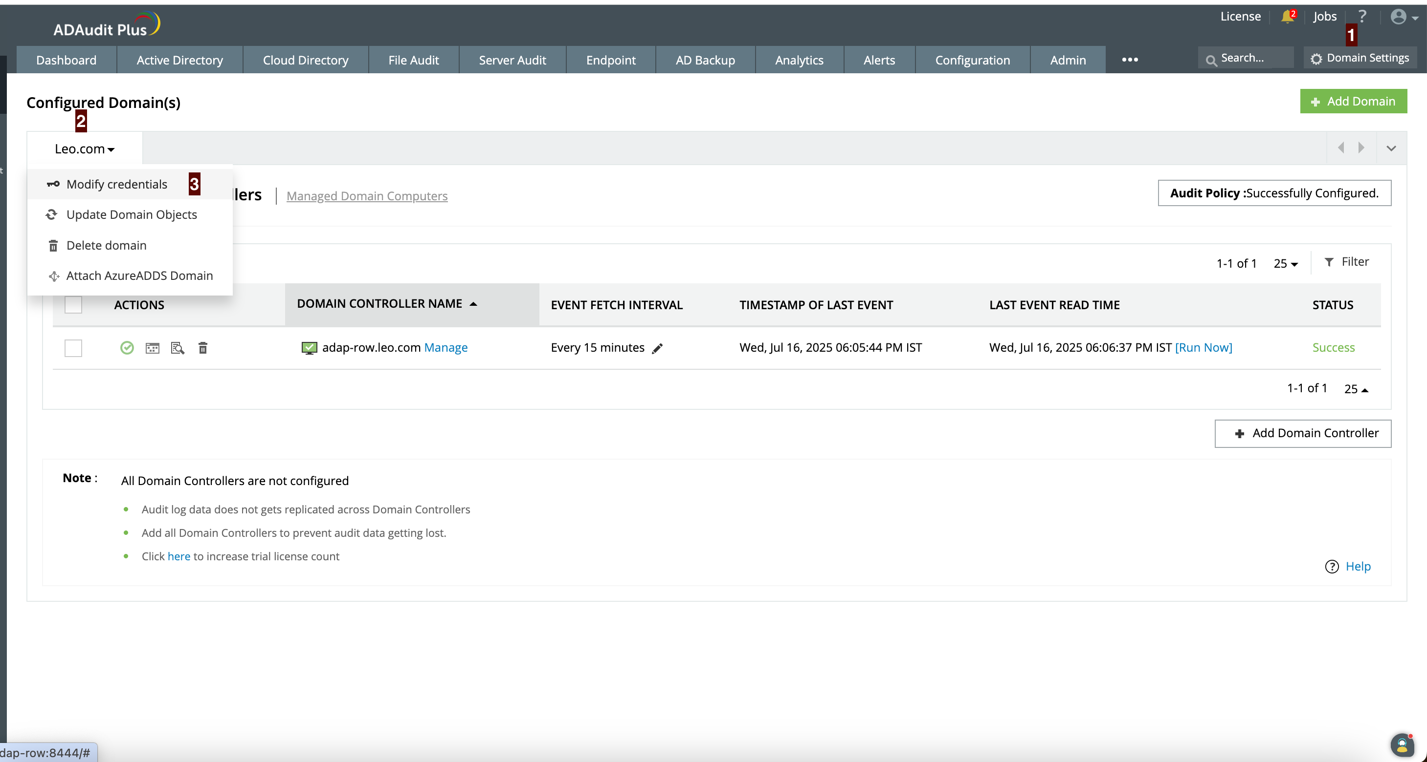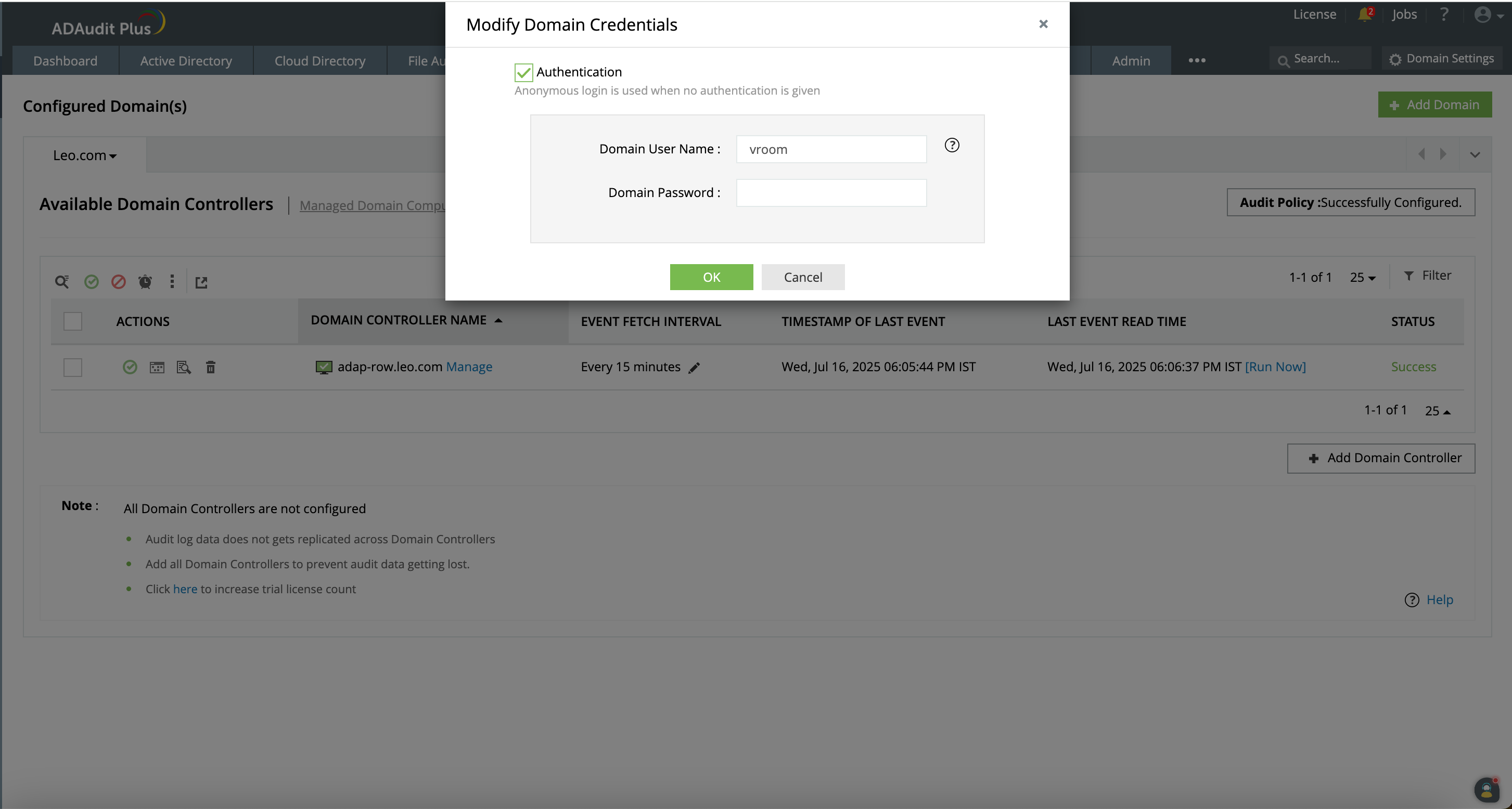Once the account is updated, ADAudit Plus will immediately begin using the new credentials for event collection, agent deployment, scheduled operations, and all other application activities.