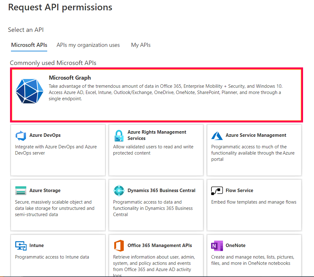 Go to Manage > API permissions and select + Add a permission to open the Request API permissions window.