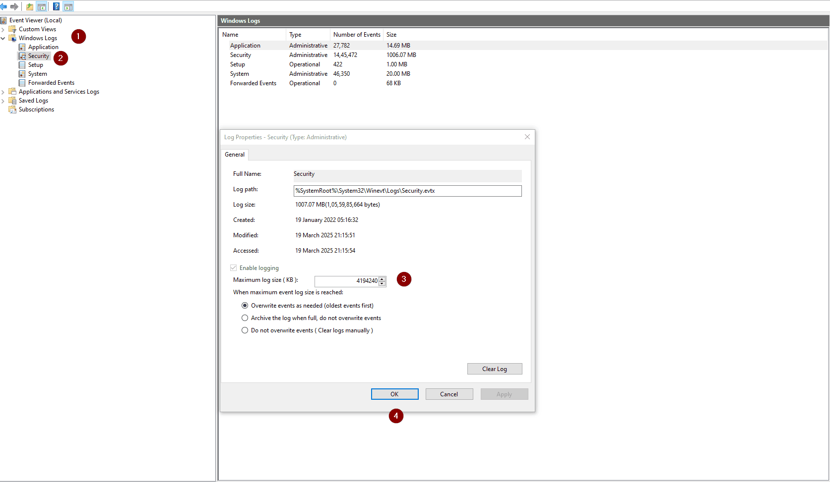 Set the Maximum log size (KB): to 4194240 KB, which is 4GB.