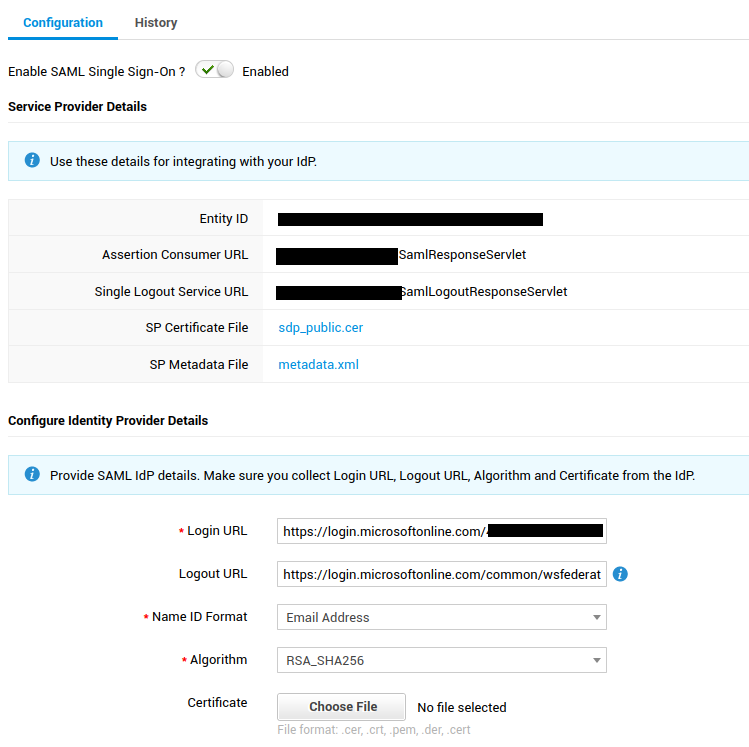 Configuring SAML Signing Certificate and Setting up ServiceDesk Plus. From the SAML Signing Certificate section, download the SAML Certificate in Base64 format. Now, login into ServiceDesk Plus and navigate to the SAML Configuration Page available under Admin. Once there, update the Login URL, Logout URL and Certificate obtained from Azure AD under the "Configure Identity Provider Details". Against the Name ID Format format option, please choose Email Address for email based login or "Unspecified" for UPN based login and save the settings.