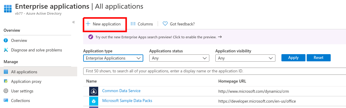 To create the Enterprise Application, login into the Azure Portal (