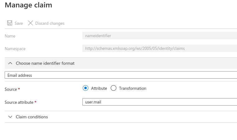 Edit the Unique User Identifier ( NameID ) claim in the Azure portal by double-clicking on the "Unique User Identifier (Name ID)" and get to the edit mode. The name identifier format should be Email Address and the source attribute should be user.mail for email based authentication. If you want to associate users based on their UPN imported from the AD, then choose "Unspecified" as the NameID format and choose user.userprincipalname as the source attribute. Then save the settings.