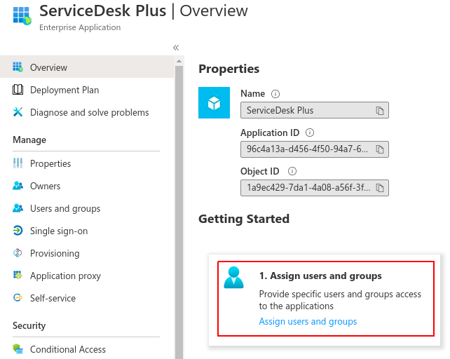 Once the Application is Created, the first step will be to add Users to the Application. Click on Assign Users and groups and then click on Add Users. This will give you the list of users in Azure AD. Now, select all the users who should be able to access ServiceDesk Plus via Azure SAML and add them to the Application by clicking on the Assign button.