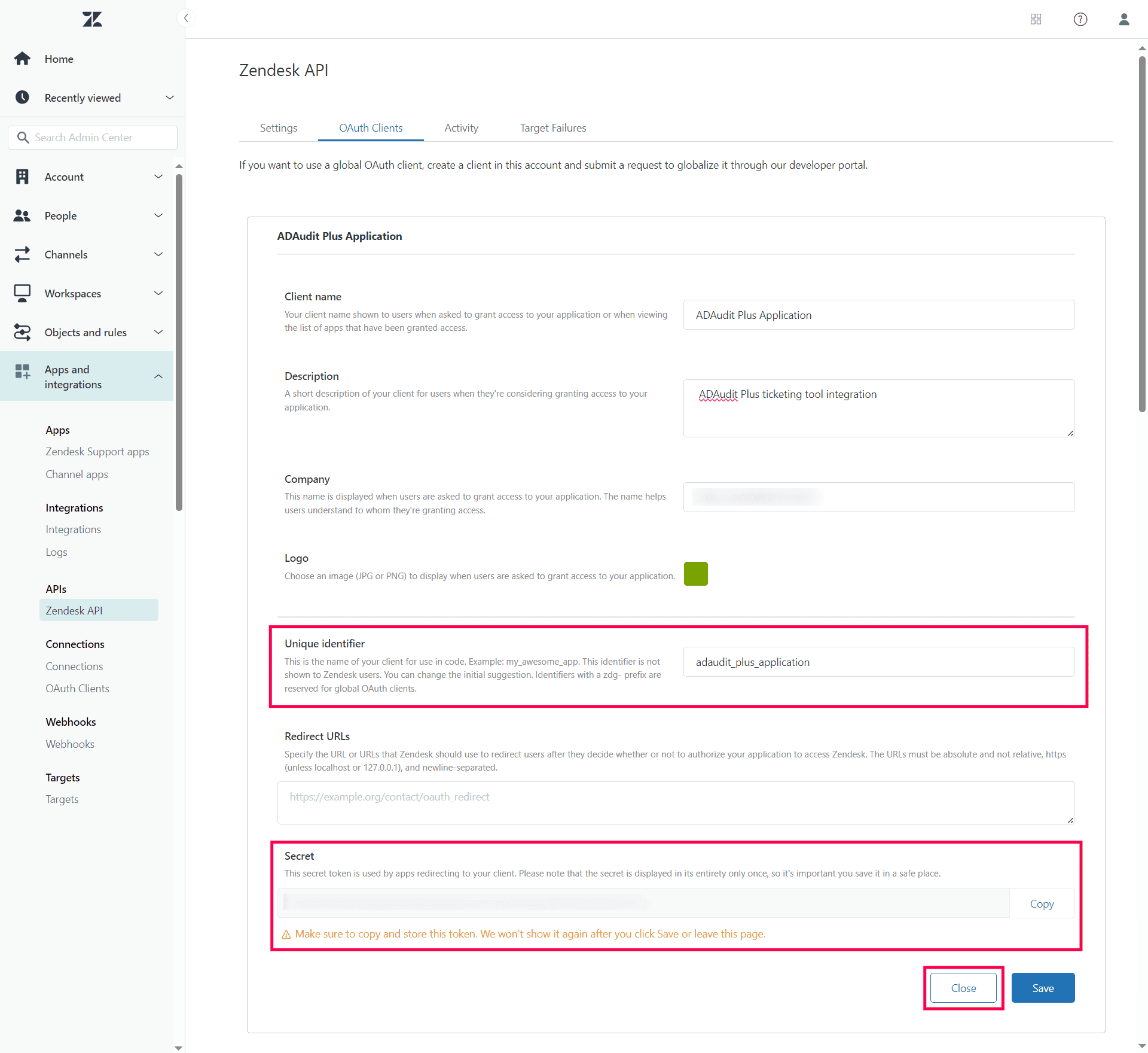 Copy the Secret code that is generated and paste it in a secure location, as this will also be needed when configuring Zendesk in ADAudit Plus. Once you click Save and close this window, the full token will never be displayed again.