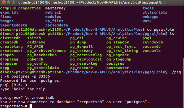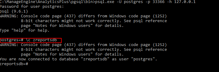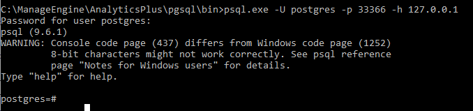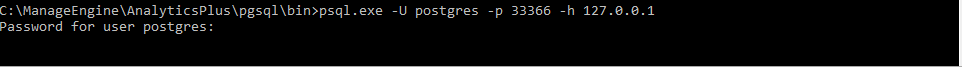C:\ManageEngine\AnalyticsPlus\pgsql\bin>psql.exe -U postgres -p 33366 -h 127.0.0.1