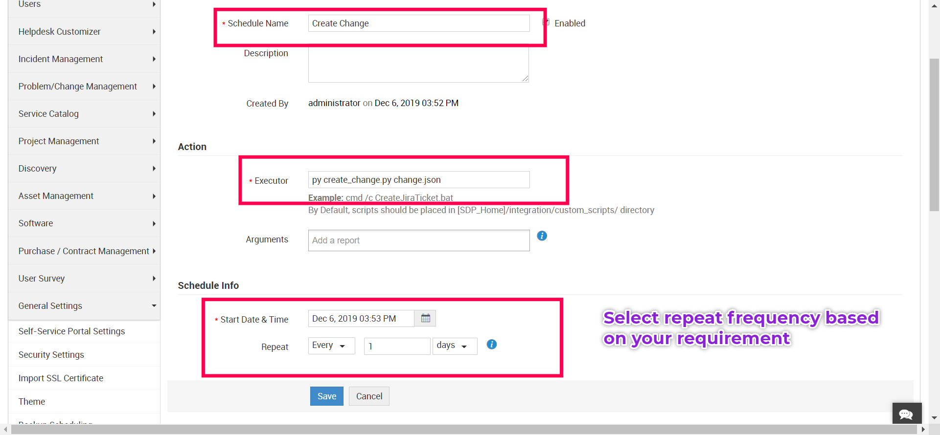 This is a sample python script that triggers the creation of a Change Request in ServiceDesk Plus using the Change API based on a schedule