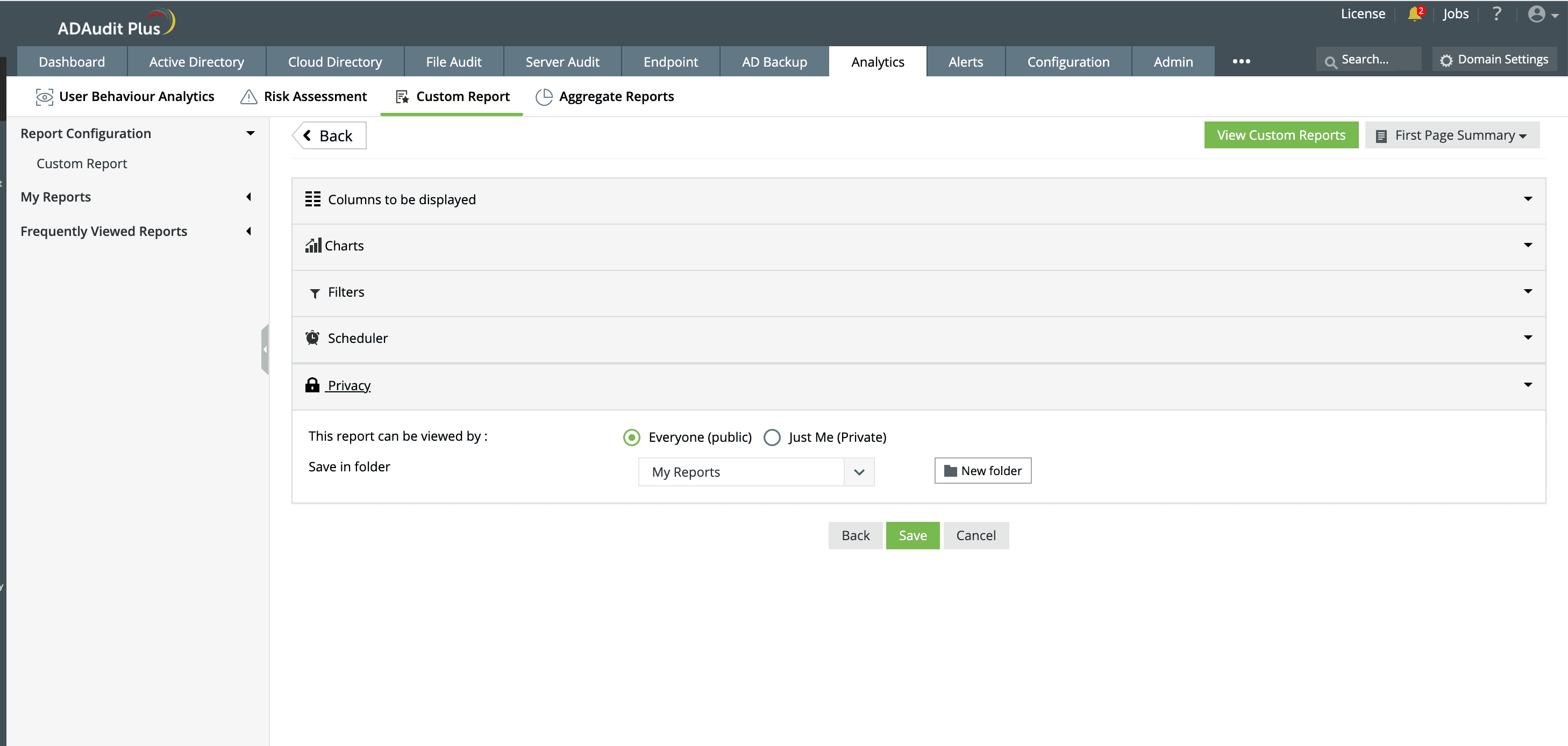 You can also set the privacy of the custom report to define who can view it, choosing between public or private.