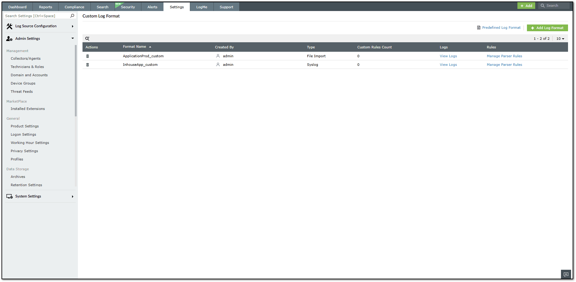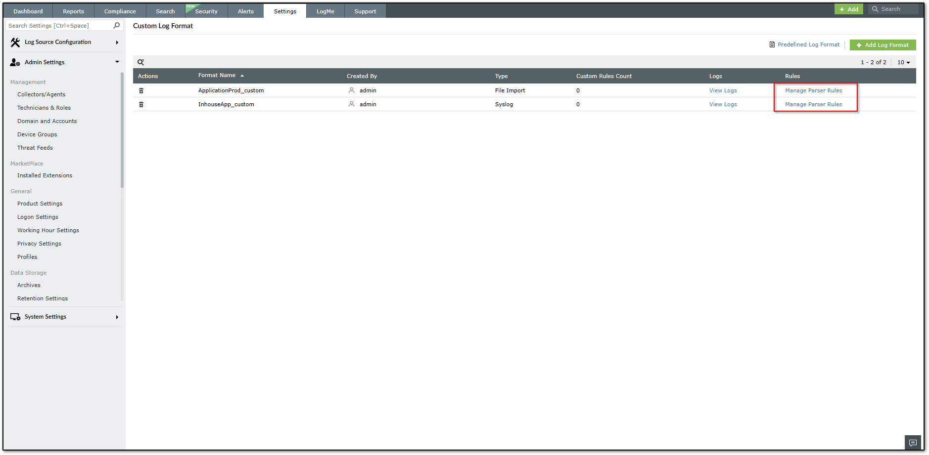 NOTE: Parser rules will be mapped to the Log format for which the log source is associated to. During Log import or post onboarding a syslog device you can select the log format that you have created in Custom Log Format settings.