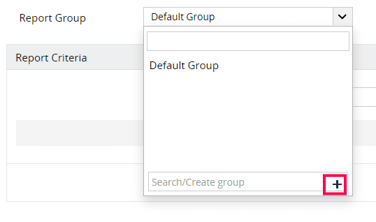 Click Report Group to add the new report to the desired group. The drop down displays all available report groups under Custom Reports. Select one of these or create your own group and click '+'. If not specified, the custom report will be added to the Default Group.