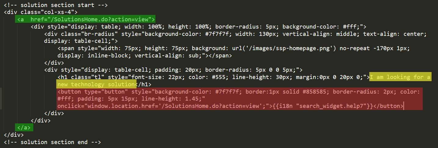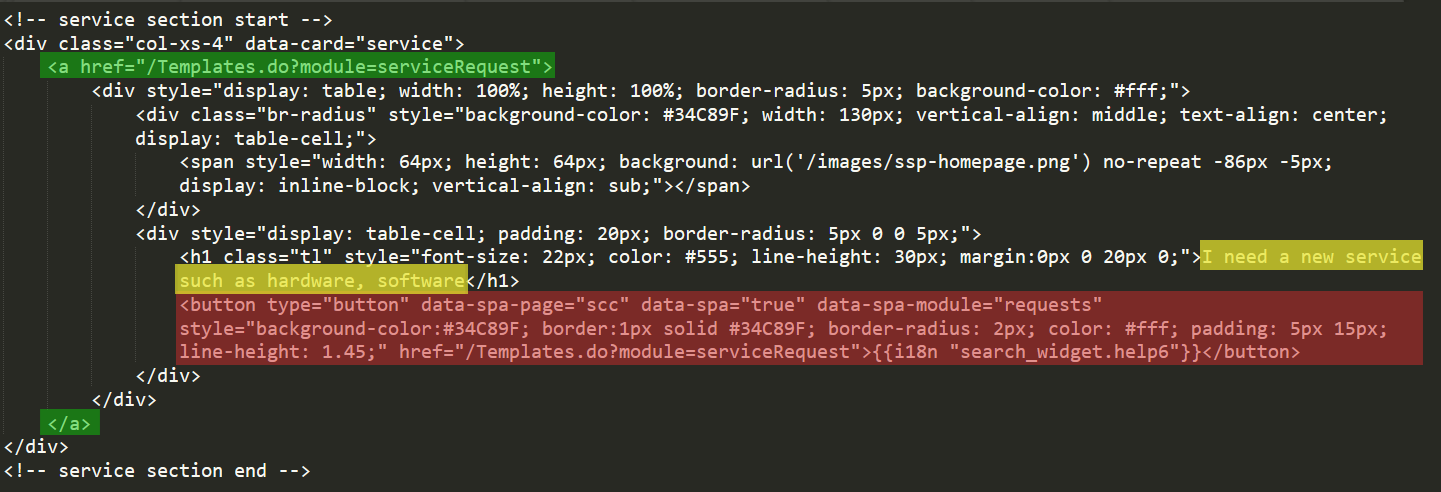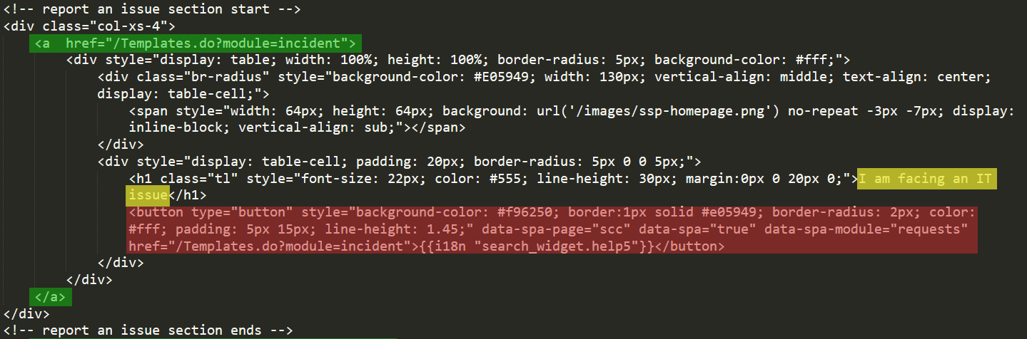 In the requester home page, each box should be a button and when clicked anywhere on the box they should be redirected to the respective Subcategories to select the Incident or Service Template or the Solutions.