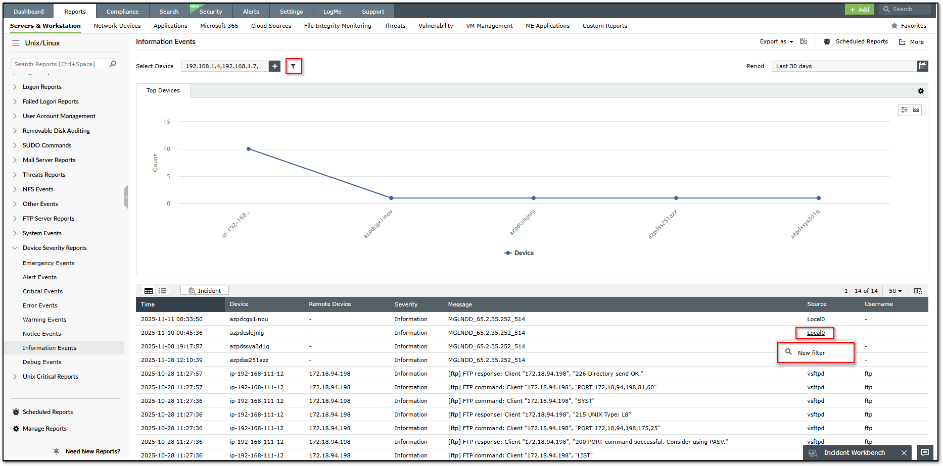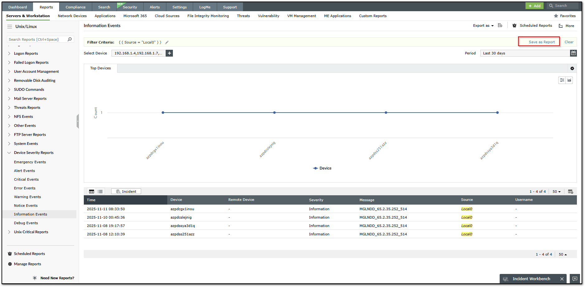 EventLog Analyzer offers option to build criteria or refine the predefined reports by adding filters and to save them as custom report. Adding filter offers you an option to filter out specific data based on the criteria that you build using the available fields for the report. This filtered report can be saved as custom report which serves as a customized predefined report in EventLog Analyzer.