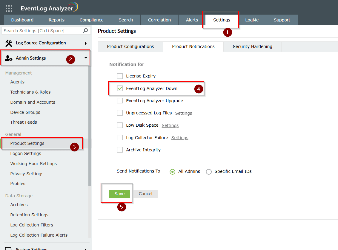 EventLog Analyzer includes a built-in mechanism to notify administrators when the application service unexpectedly stops or crashes. This helps ensure that service interruptions are identified and addressed promptly. This document provides step-by-step instruction on how to enable notification for EventLog Analyzer service downtime.