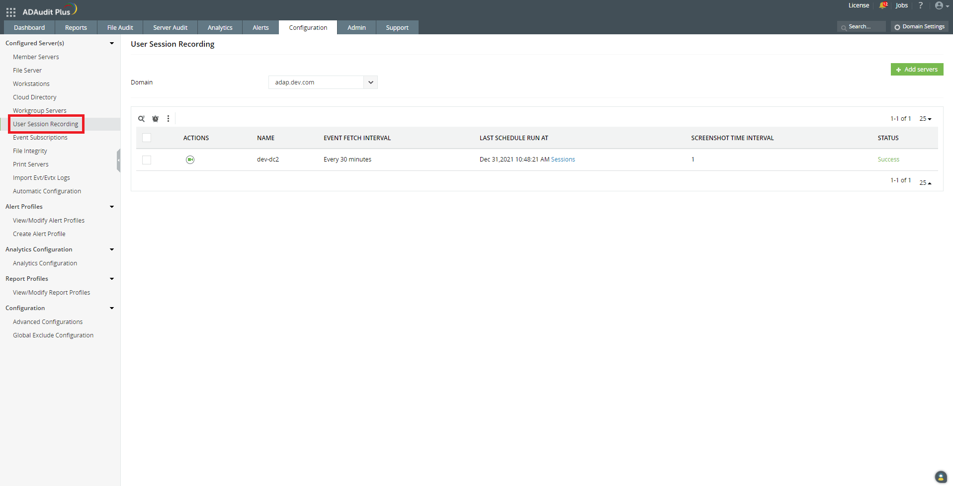 Navigate to the Configuration tab > Configured Server(s) > User Session Recording.