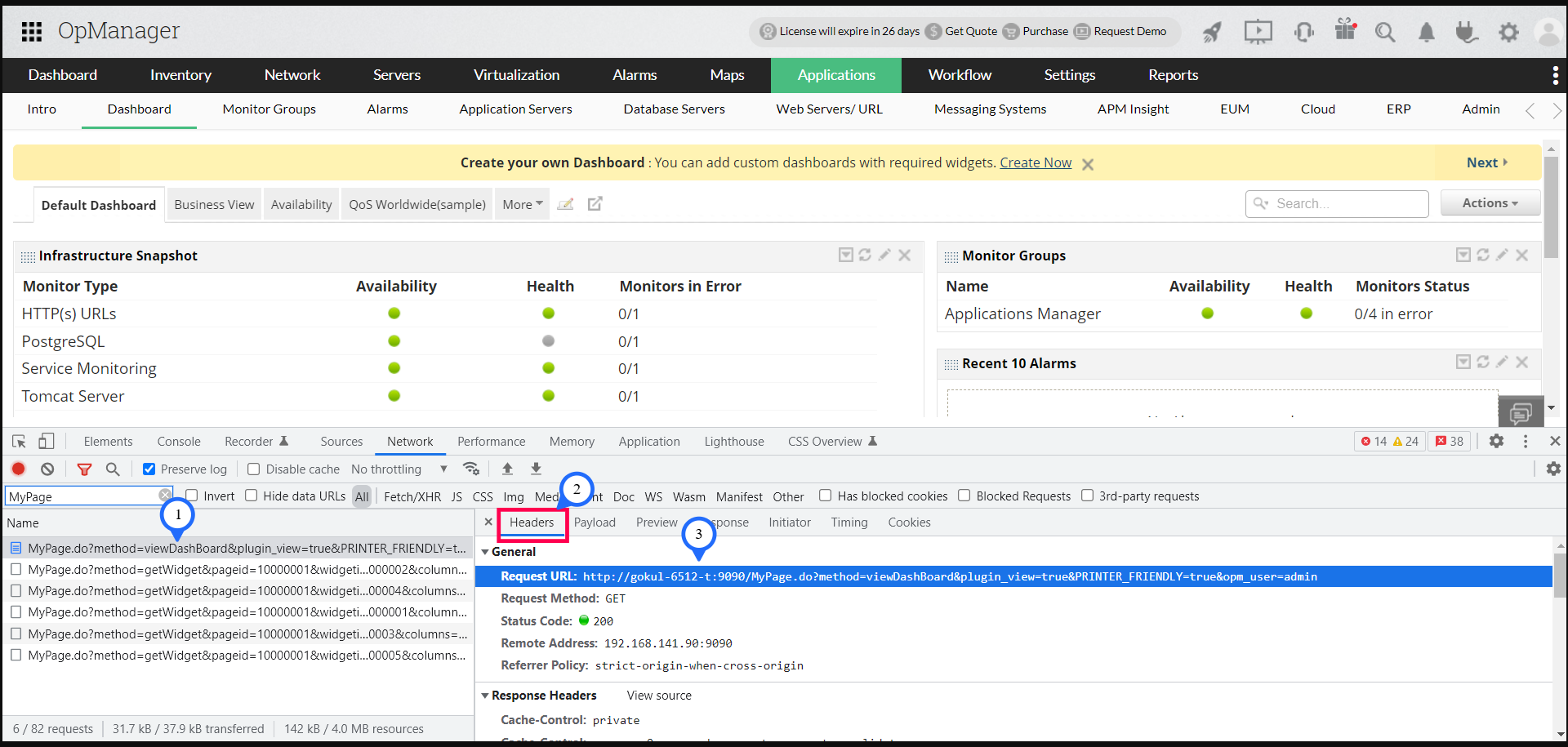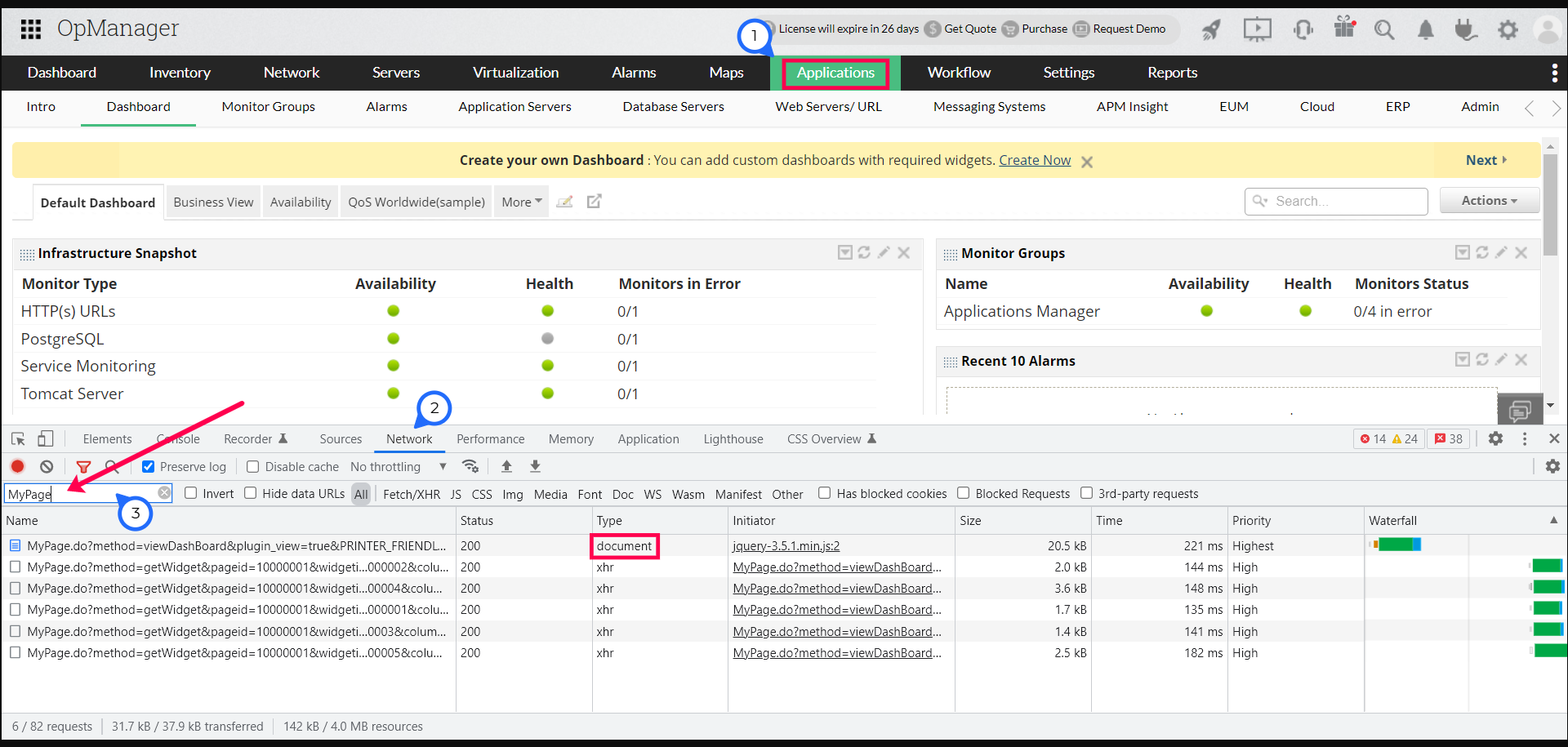 In the OpManager console, go to Applications tab to trigger the plugin network requests. Then, in the Developer Tools Network tab's search/filter bar, search for MyPage.do or showresource.do