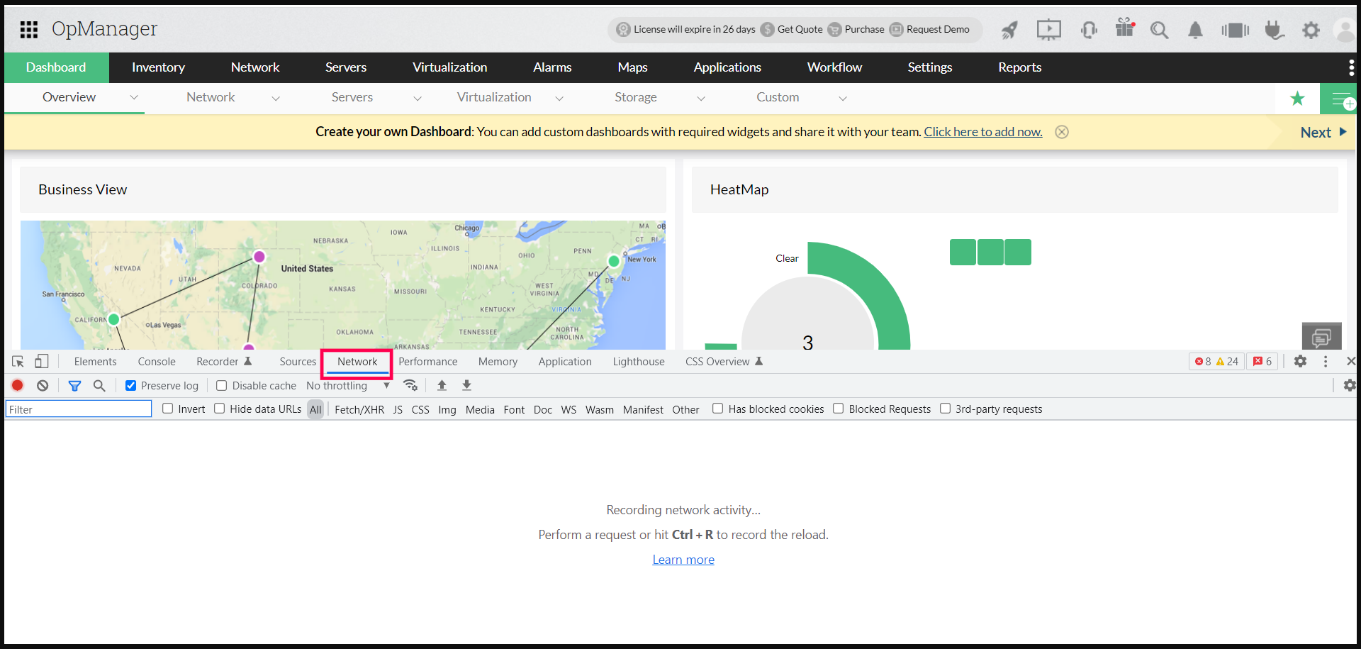While on the OpManager page, press Ctrl + Shift + I (Windows/Linux) or Cmd + Option + I (Mac) to open the browser's Developer Tools (Inspect) panel. Then, click on the Network tab at the top of the Developer Tools panel.