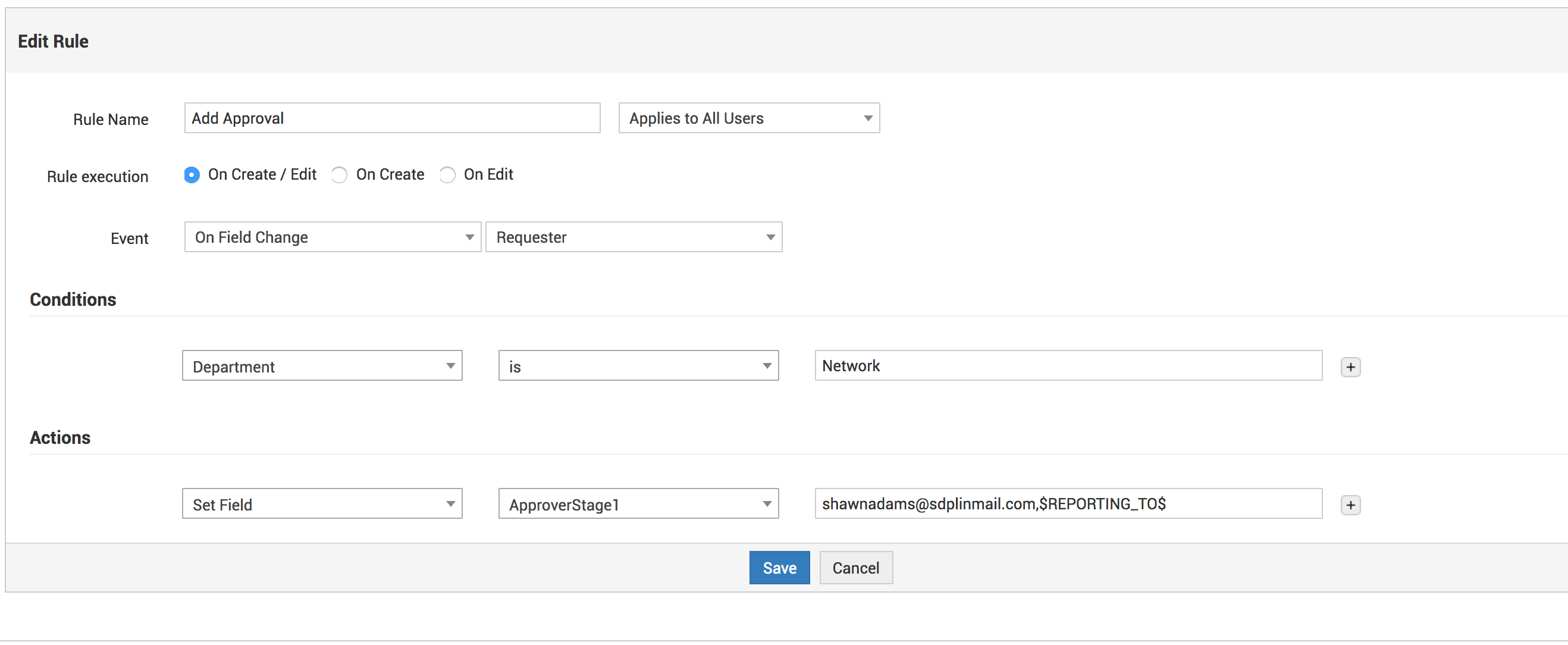 3. Go to Admin > Service Templates > Select a particular template > Field and Form Rules > Rule execution - On Create / Edit > Event - "On Field Change" - "Requester" > Conditions - "Department=Network" > Actions - Set Field - First additional field - Set the list of approvers. Eg:
