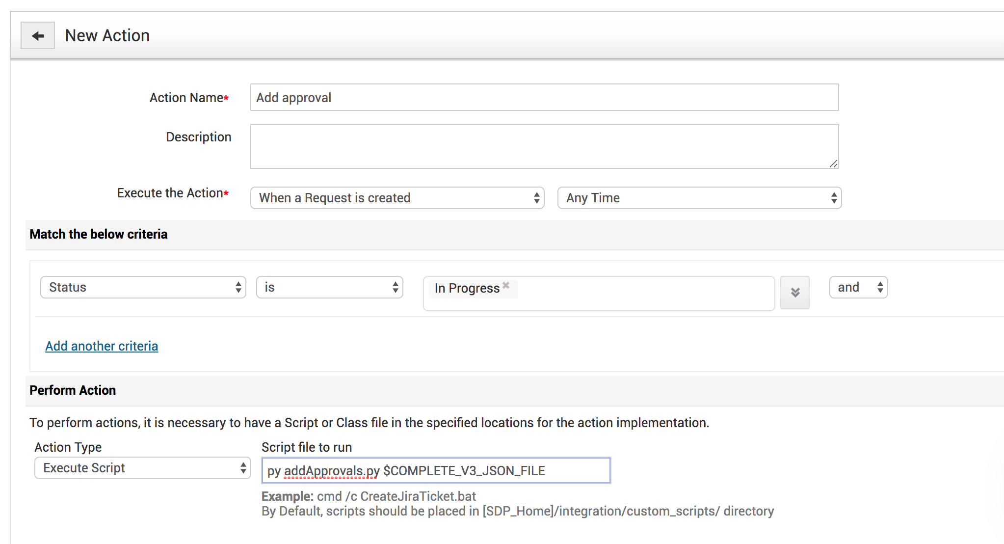 7. Configure a custom trigger to get invoked when the "Status" is "Waiting for approval". Go to Admin > Custom Trigger > give a trigger name > execute script > py addApprovals.py $COMPLETE_V3_JSON_FILE and set the criteria as "Status=Waiting for approval"