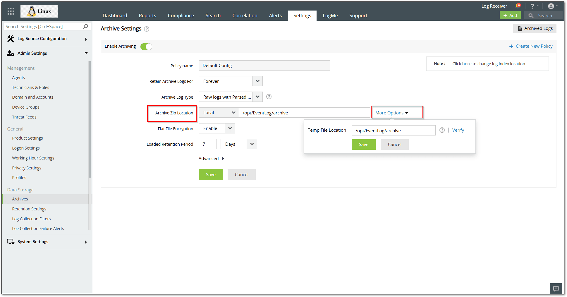Step 1: Go to Settings > Admin Settings > Archives > Settings and update the path in the Archive Zip Location field. Select More Options and update the temp location.