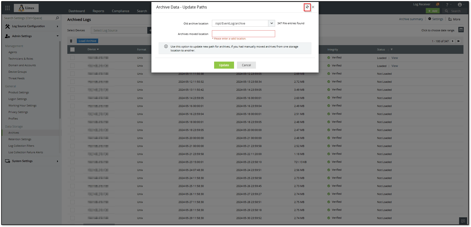 Step 3: Go to Settings > Admin Settings > Data Storage > Archives > More (in the top-right corner) > Update Path.