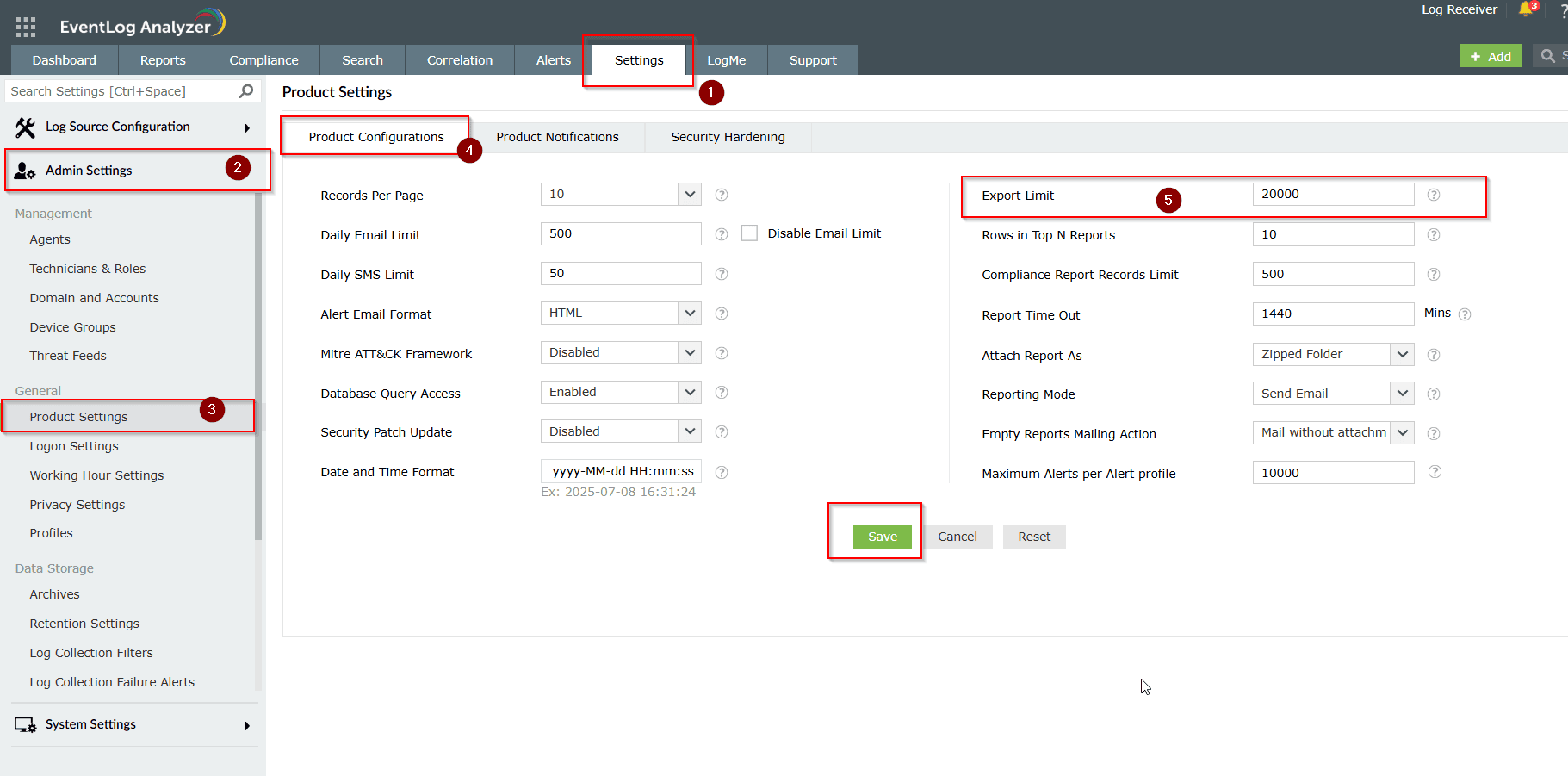 EventLog Analyzer allows administrators to export report data for external analysis or archival. By default, the export limit is set to 20,000 records to ensure optimal performance and user experience. This limit can be adjusted to meet organizational reporting needs.