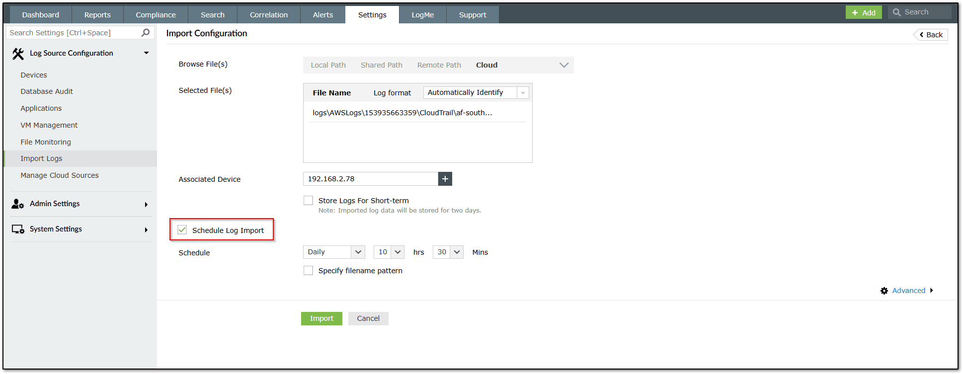 EventLog Analyzer supports scheduled log imports from both remote paths and S3 buckets. You can enable scheduled log collection to have the application read data from the same file at regular intervals, or configure a file naming convention based on the created file name pattern by the respective device/application, so that new files are imported periodically.