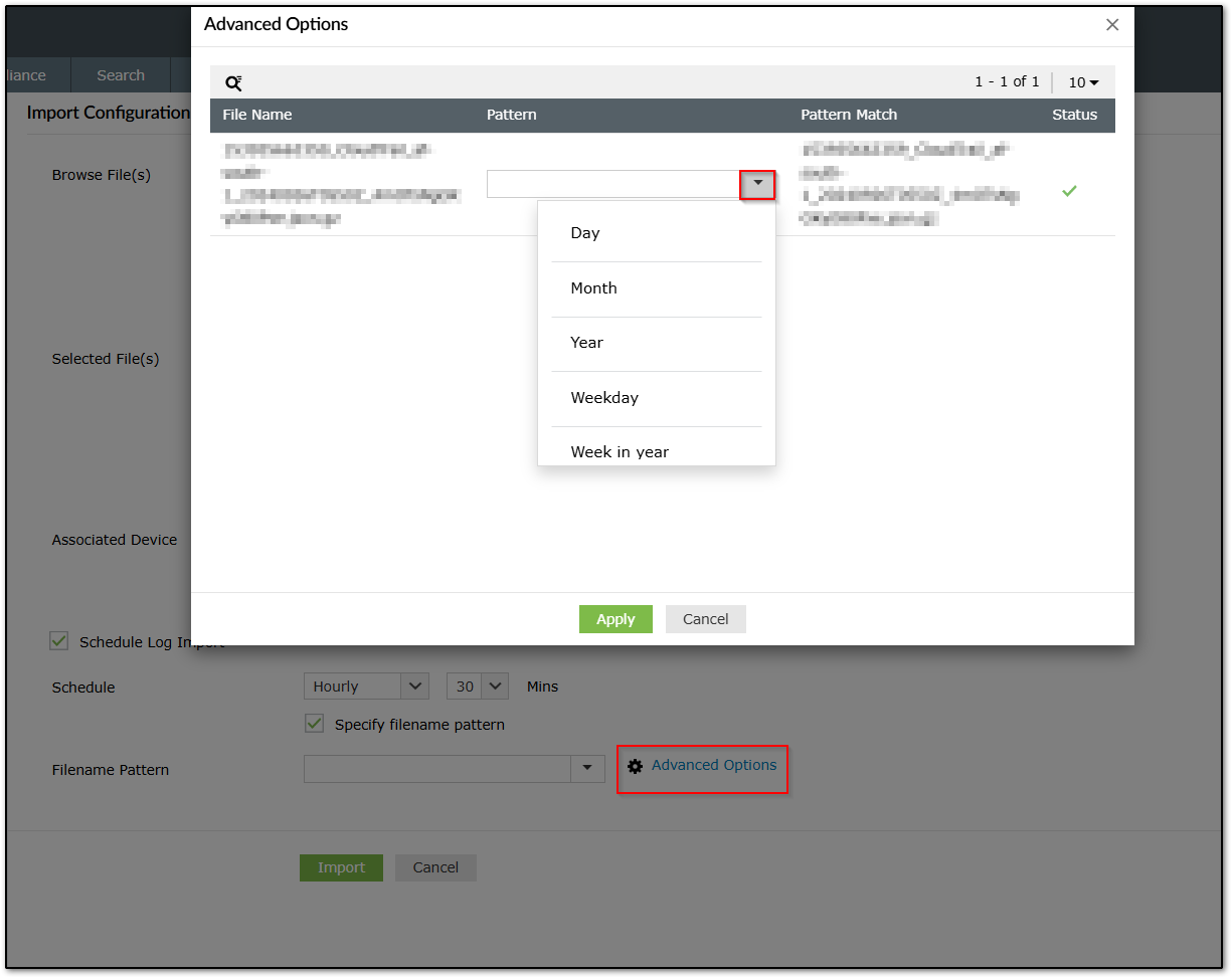 Verify that the naming convention is applied correctly by reviewing the imported log filenames under Advanced Options.