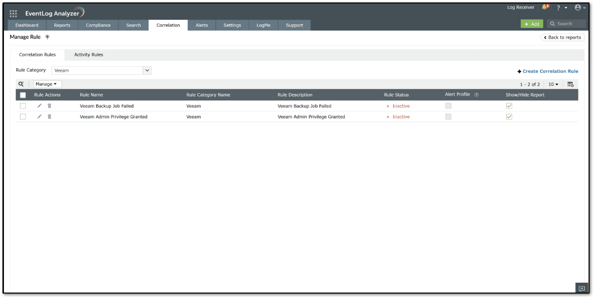 You will be redirected to Correaltion Tab. Select Veeam from the Rule Category selector to view the available correlation rules. Review the available correlation rules and enable the required ones.