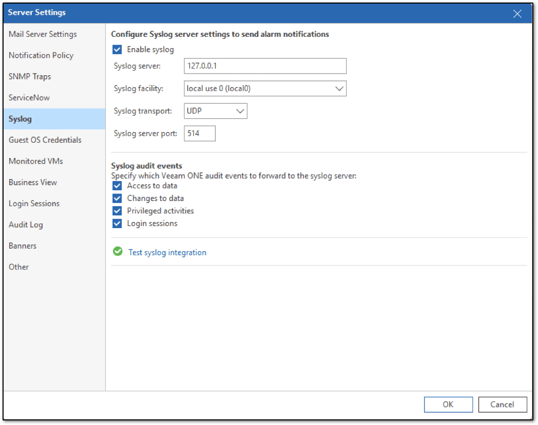 Open Veeam ONE Client and navigate to Server Settings > Syslog.