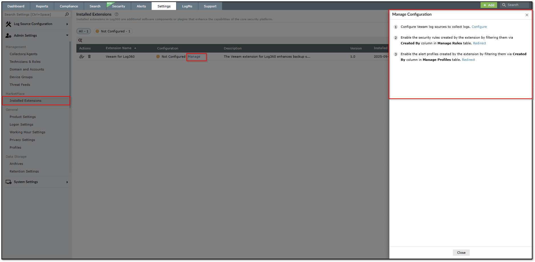 1. After configuring the log source, navigate to Settings > Marketplace > Installed Extensions. Click Manage under configuration to open the Manage Configuration page. Choose "Configure" under Manage Configuration.
